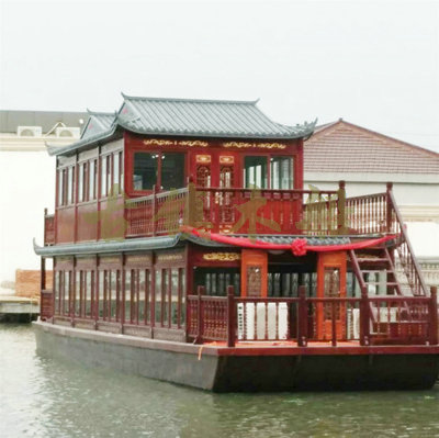 畫舫船就是裝飾古典華麗的游船,是"中國(guó)風(fēng)"的仿古游船,結(jié)合古典園林建筑,體現(xiàn)了中華文明的古典藝術(shù).畫舫船豪華而又古典,船上的建筑按照中國(guó)古代建筑里的亭臺(tái)樓閣,建筑工藝之復(fù)雜,要求之嚴(yán)格,仿古畫舫游船的特點(diǎn)飛檐翹角、玲瓏精致的四角亭子逐漸成形,赫然立于船頭,美人靠、盤龍柱子、彩畫……龍柱上的浮雕盤龍和祥云一層扣著一層,層層錯(cuò)落有致,雕刻精細(xì)到盤龍身上的每一個(gè)鱗片都細(xì)細(xì)可數(shù),古代皇家標(biāo)志性元素,在畫舫船上體現(xiàn)的淋漓盡致。除了雕刻、花窗,整條船還有一個(gè)看點(diǎn),那就是弧線優(yōu)美、高高翹起的船尾。游船并不大,長(zhǎng)約10米、寬3米,但是整體看起來堪稱一件藝術(shù)品。船尾的雕花欄桿與船艙、船頭的雕刻遙相呼應(yīng),船身四周貼著浮雕祥云,給整條船增添了富貴、華麗的氣質(zhì)。